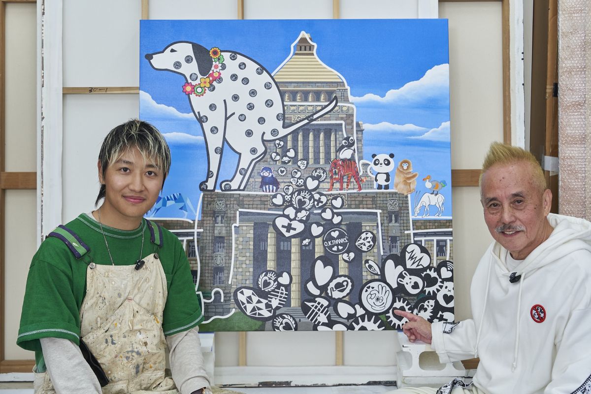 原氏が長年描き続けてきた「SUPER Love DOG」シリーズから生まれた、O.K.THANKS.のための新作。久次米 慧人の「ポジティブ思想」や「スピード感」を意識した輪郭・色彩設計で、世界に1枚だけのユニークピースとして制作されました。